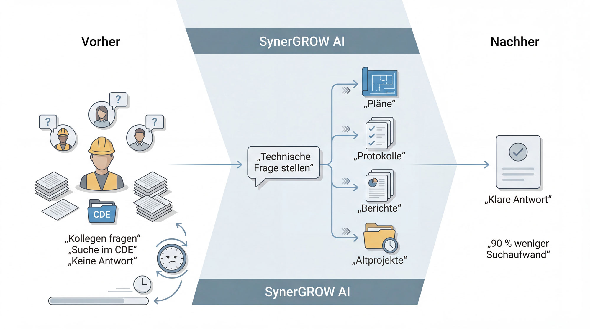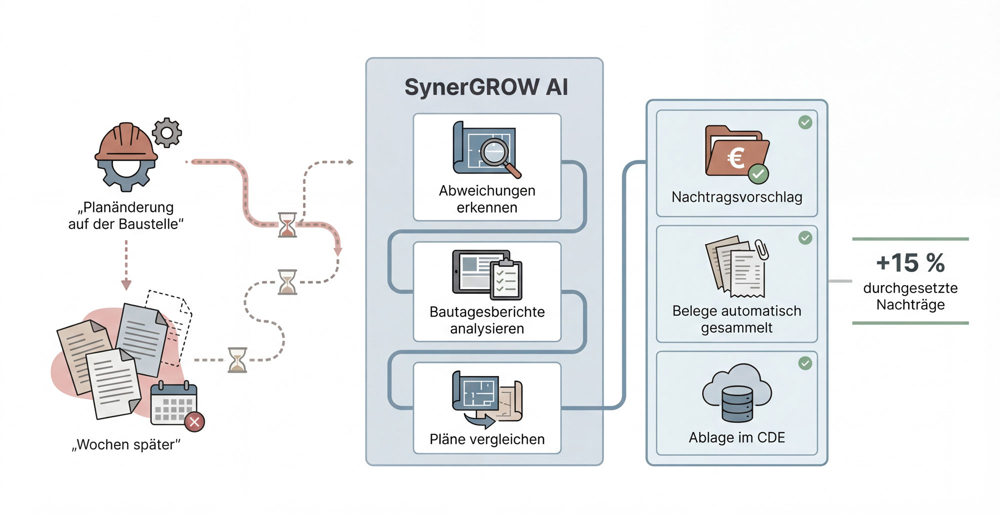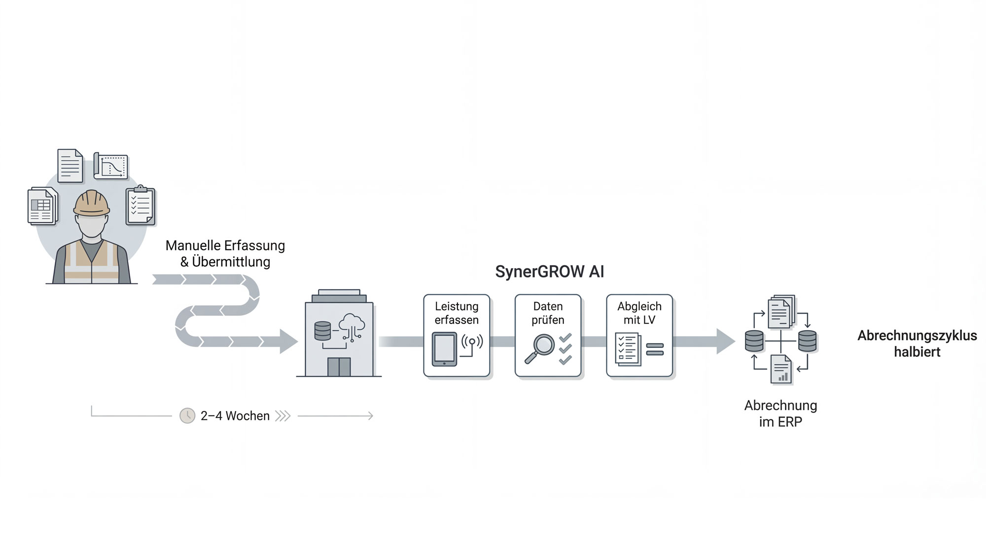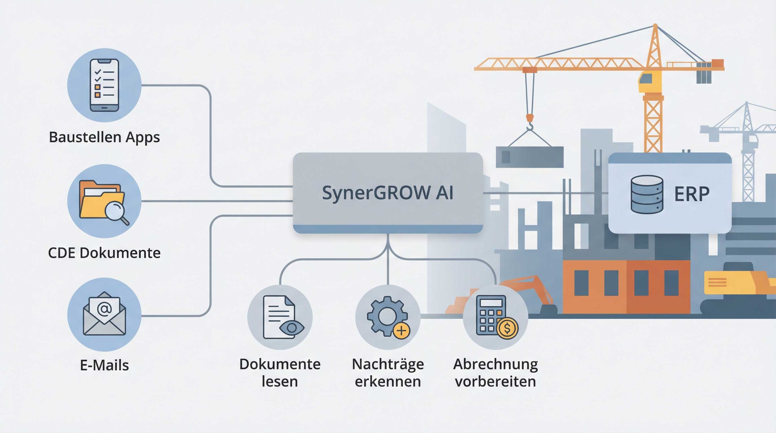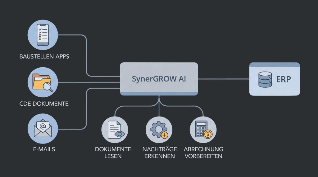 SynerGROW AI automatisiert deine Geschäftsprozesse im Bauwesen mit KI –systemübergreifend, auf Basis deiner bestehenden Software.