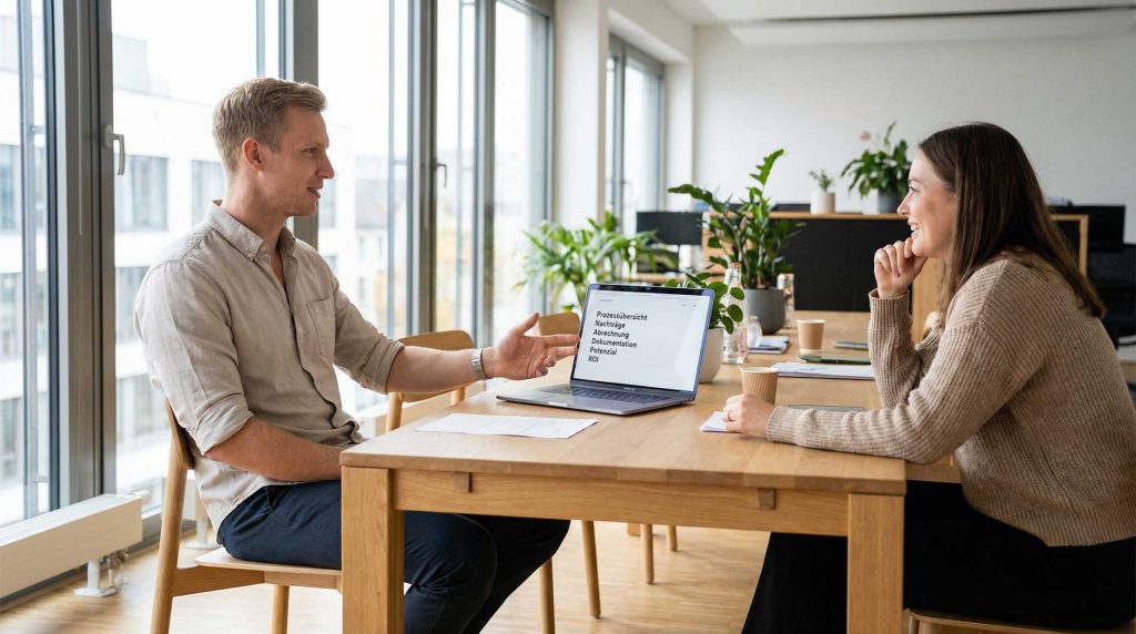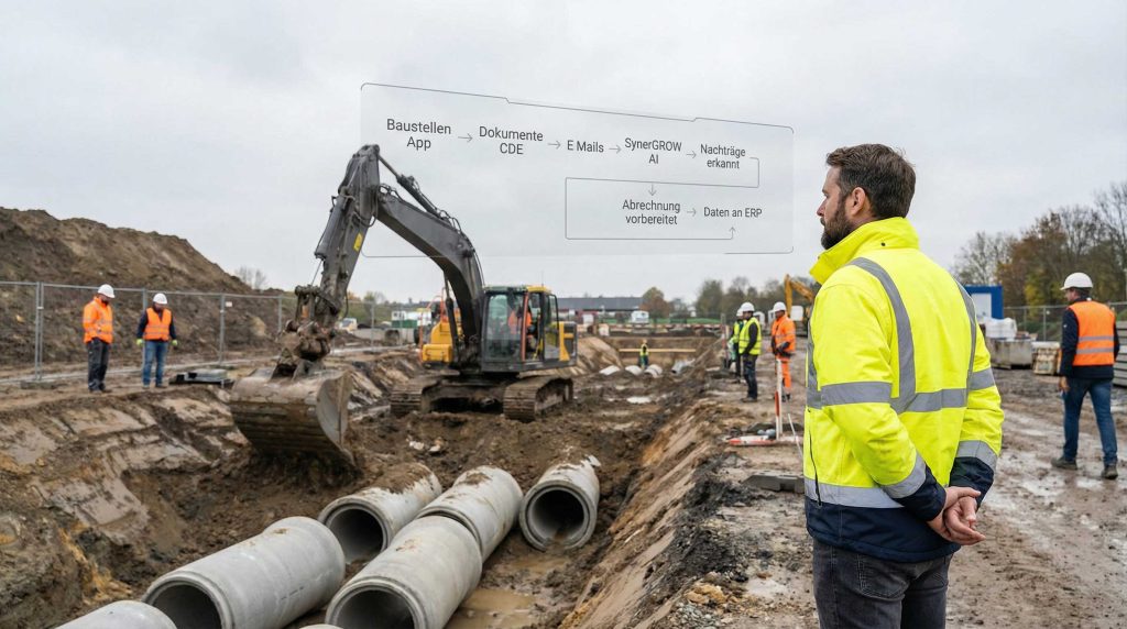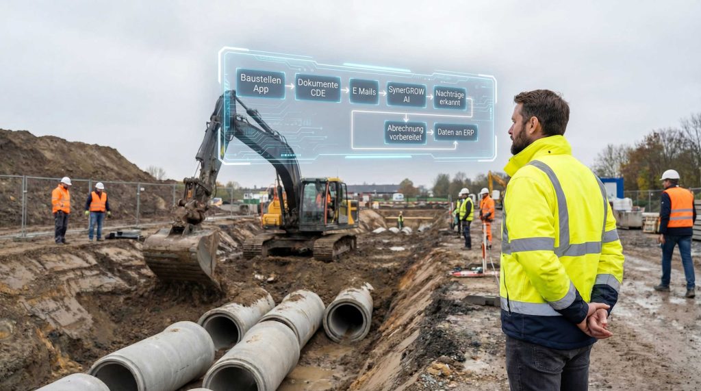 SynerGROW setzt genau dort an. Wir analysieren einen konkreten Ablauf, zum Beispiel Nachträge, Dokumentation oder Abrechnung. Dann verbinden wir die vorhandenen Systeme so, dass Informationen nicht mehr liegen bleiben. KI übernimmt das Sortieren, Prüfen und Weiterreichen der Daten automatisch. Das reduziert administrativen Aufwand um 60 bis 80 Prozent. Belegt durch Branchenanalysen.