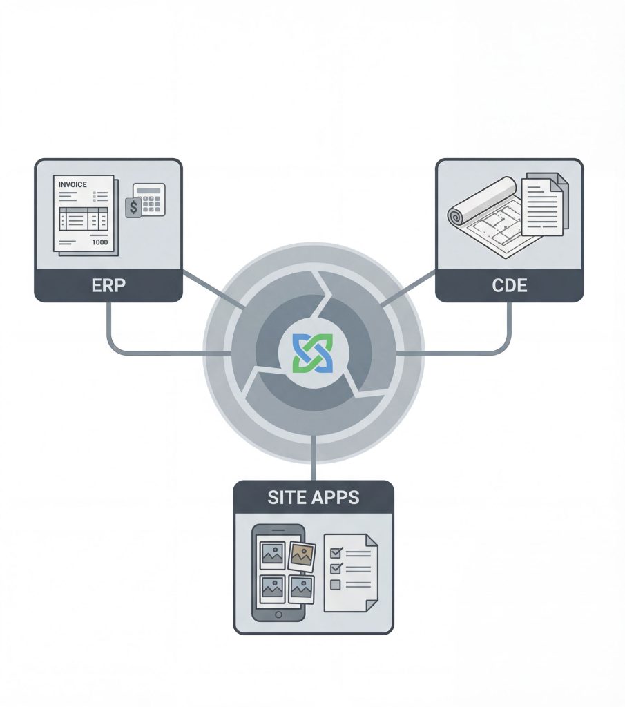 Wir installieren kein neues Tool. Wir verbinden, was du bereits hast: ERP, CDE, Baustellen-Apps. Damit Informationen fließen, Prozesse durchgängig werden und dein Geld bei dir ankommt.